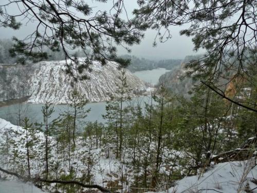 Wycieczkę prowadził kol. Lech Segiet- zaprowadził nas do zalanego wyrobiska po nieczynnym już kamieniołomie, gdzie w tym jeszcze zimowym, dniu było szczególnie urokliwie...